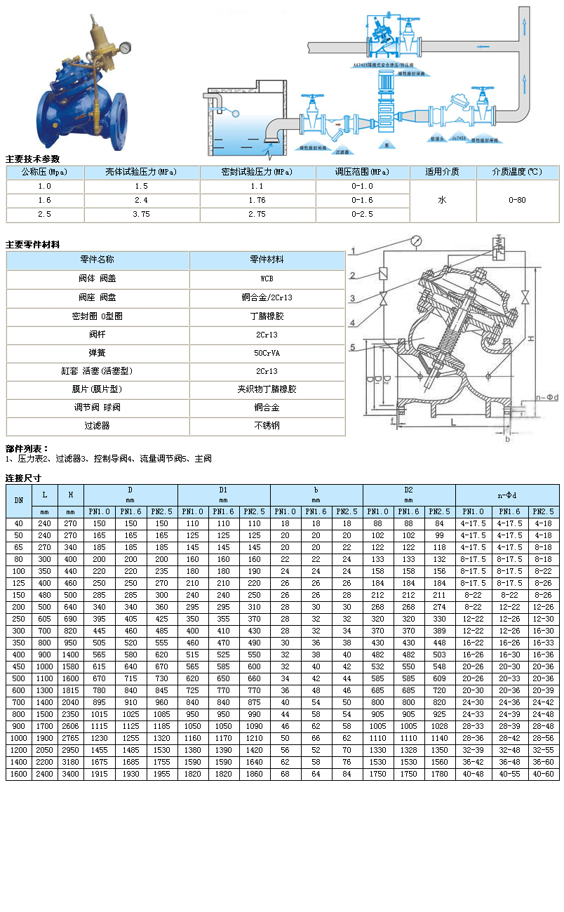 工作原理當(dāng)管道從進(jìn)水端給水時(shí),水流過(guò)針閥進(jìn)入主閥控制室,出口壓力通過(guò)導(dǎo)管作用到導(dǎo)閥上,當(dāng)出口壓力高于導(dǎo)閥設(shè)定值時(shí),導(dǎo)閥關(guān)閉,控制室停止排水,此時(shí)主閥控制室內(nèi)壓力升高并關(guān)閉主閥,出口壓力不再升高。當(dāng)出口壓力降到導(dǎo)閥設(shè)定壓力時(shí)導(dǎo)閥開(kāi)啟,控制室向下游排水。由于導(dǎo)閥的排水量大于針閥的進(jìn)水量,主閥控制室壓力下降,進(jìn)口壓力使主閥開(kāi)啟。穩(wěn)定狀態(tài)下,控制室進(jìn)水、排水相同,開(kāi)度不變,出口壓力不變。調(diào)節(jié)導(dǎo)閥彈簧即可設(shè)定出口壓力。