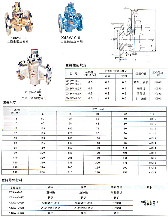 X43W二通全銅-鑄鐵-不銹鋼旋塞閥,主要性能規(guī)范: 型號 公稱壓力 (MPa) 試驗壓力PS(MPa) 適用介質(zhì) 工作溫度(℃) 殼體 密封 X43W-10 1.0 1.5 1.1 煤氣、油品 ≤100 主要零件材料: 零件名稱 閥體 塞子 填料壓蓋 填料 X43W-10 鑄鐵 鑄鐵 鑄鐵 油浸石棉盤根 柔性石墨